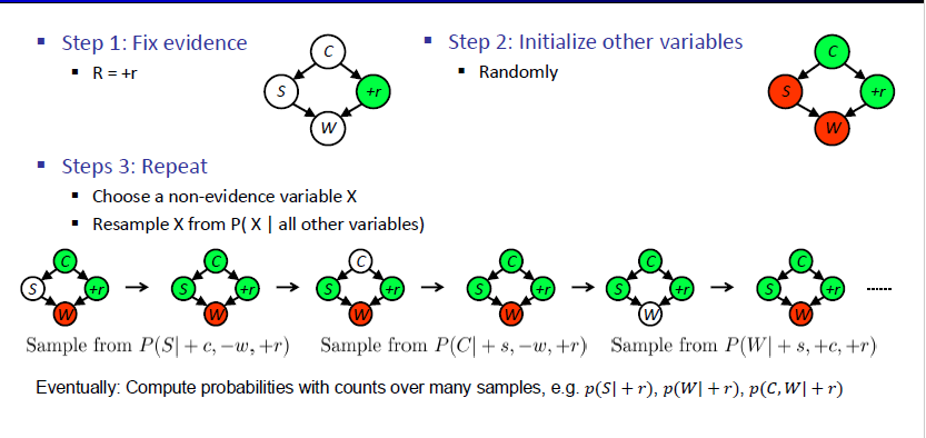 Procedure:Keep track of a full instantiation x 1, x 2, …, xn. Start with an arbitrary instantiation consistent with the evidence. Sample one variable at a time, conditioned on all the rest, but keep evidence fixed. Keep repeating this for a long time.