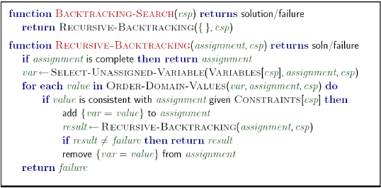 约束满足问题传统上是使用一种称为backtracking search回溯搜索的搜索算法来解决的。回溯搜索是深度优先搜索的一种优化,专门用于约束满足问题,其改进来自两个主要原则: